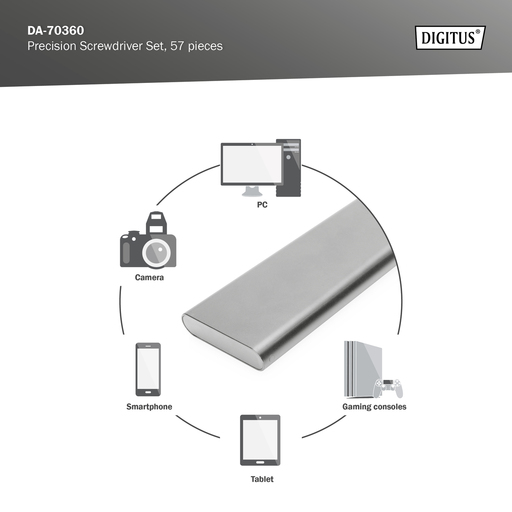 DescrizioneIl set di utensili DIGITUS contiene unÆampia selezione di inserti per cacciavite, il tutto in una pratica scatola di alluminio facile da trasportare e pronta allÆuso.Gli inserti per cacciavite sono realizzati in pregiato acciaio per utensili S2 e sono robusti e di lunga durata.Per la riparazione di smartphone, lÆinstallazione di accessori per computer o la costruzione di modelli: lÆinserto giusto Þ sempre a disposizione.Dettagli tecnici Set cacciavite 57 pezzi Punte per cacciavite: Acciaio per utensili S2 Scatola di conservazione: Metallo 56 punte per cacciavite: 4 Torx«: T1, T2, T3, T4 8 Security Torx«: T5H, T6H, T7H, T8H, T9H, T10H, T15H, T20H 2 forma a U (Snake Eye): U2.0, U2.6 9 esagonali: H0.7, H0.9, H1.3, H1.5, H2.0, H2.5, H3.0, H3.5, H4.0, 3 triangolari: 2.0, 2,3, 3.0 2 espulsori scheda SMI 3 Pentangram: P2(0.8), P5(1.2), P6(1.5) 4 Tri-Wing: Y0.6, Y2.0, Y2.5, Y3.0 6 Philips: PH0000, PH000, PH00, PH0, PH1, PH2 1 IN Philips: IN PH2 8 con intaglio: SL 1.0, SL 1.3, SL 1.5, SL 2.0, SL 2.5, SL 3.0, SL 3.5, SL 4.0 3 quadrate: S0, S1, S2 2 Philips 2.5 per iPhone 1 dado M2,5 Dimensioni (Lungh.x Largh.x Alt.): ca.162 x 65 x 16 mm Peso: 299 g