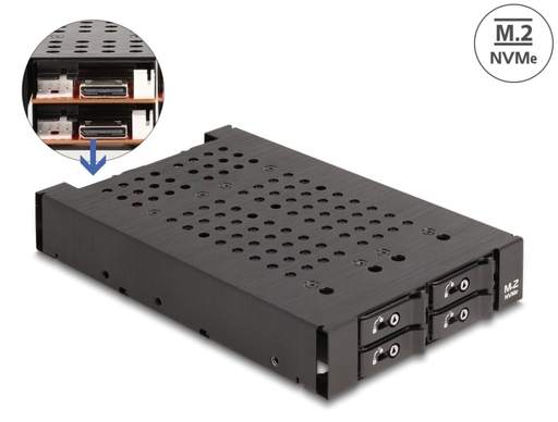 This solid metal mobile rack by Delock can be installed into a 3.5 bay of a PC and provides four M.2 slots in 2280, 2260, 2242 or 2230 format.