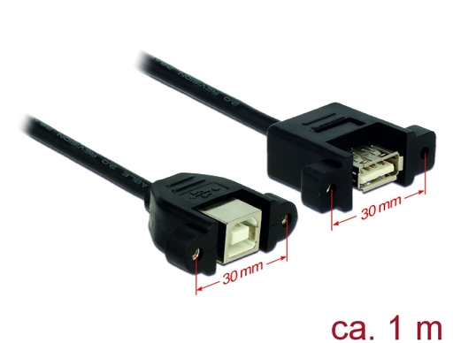 This cable by Delock can be used to extend a USB 2.0 connection and to connect various devices. The female ports can be attached with two screws, e.g. to a slot bracket, a cable duct or an enclosure with the corresponding opening. In this way, it is possible to install a USB connector in an easily accessible position.