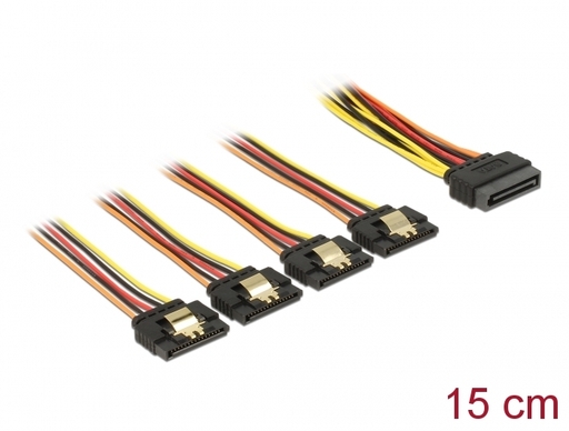 This cable by Delock can supply power for four SATA devices via one free SATA 15 pin power connector of the power supply. The metal clips on the receptacles and the clearance on the plug ensure that the cable reliably clicks into place.