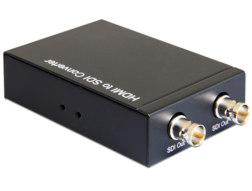 This Delock converter can be used to convert an HDMI signal to an HD- or 3G-SDI signal. You can connect e. g. a camera with HDMI output to an HD-SDI recorder. The SDI signal is transmitted via a conventional 75 Ohm coaxial cable with BNC connectors.
