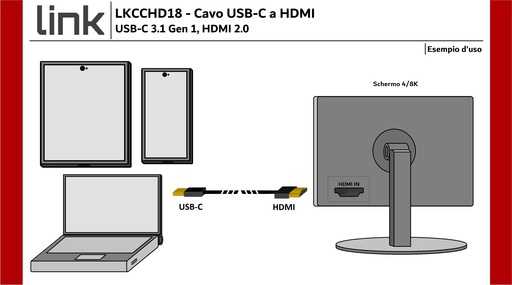 Cavo per il collegamento di un dispositivo USB-C« come uno smartphone, tablet o notebook, a un video o TV HDMI. Raggiunge una risoluzione HDMI 2.0 fino a 4K x 2K60Hz 4:4:4. Alimentazione mediante attacco USB-C«, non necessita di alimentazione Supporta HDCP 2.2 Latenza: Zero frame delay Contatti dorati Lunghezza 1.80 mt. Materiale: rame Sezione 32AWG Supporta USB 3.1 Gen. 1 VelocitÓ di trasferimento dati: 5 Gbps Plug and Play - non serve installare driver Il vostro dispositivo deve supportare la modalitÓ video DisplayPort« (DP Alt Mode) per essere compatibile con questo adattatore/convertitore. La capacitÓ di uscita video dipende dalla scheda grafica del computer portatile e dal monitor collegato. Alcuni schermi limitano anche la risoluzione disponibile.