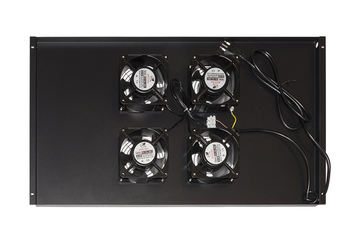 SISTEMA DI VENTILAZIONE PER RACK 19" CON TERMOSTATO E INTERRUTORE DI ACCENSIONE Raffreddano in maniera efficiente l'interno dell'armadio evitando il surriscaldamento dei dispositivi contenuti nell'armadio e quindi preservandoli da usura. Con 4 ventole 220 volt 120x120x38mm. con griglia di protezione. Si installano a soffitto dei mobili rack marchio Link profondi 1000 mm. Colore nero ( RAL9005). Con cavo di alimentazione mt. 1 con spina tripolare italiana 10A. Le viti di fissaggio sono incluse. Misure 75x41 cm.