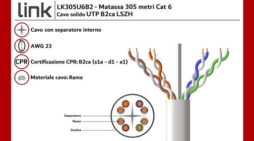 Cavo in matassa per installazione di rete categoria 6 non schermato U-UTP Halogenfree.Conforme alla Direttiva CPR (Regolamento Prodotti da Costruzione) UE 305/11, Classe B2ca s1a, d1, a1.Ove: s = opacitÓ dei fumi.Varia da s1 a s3 con prestazioni decrescenti d = gocciolamento di particelle incandescenti che possono propagare lĘincendio.Varia da d0 a d2 con prestazioni decrescenti a = aciditÓ che definisce la pericolositÓ dei fumi per le persone e la corrosivitÓ per le cose.Varia da a1 a a3 con prestazioni decrescenti.La sua classificazione secondo la direttiva CPR ne permette l'istallazione in fascio dentro le canaline, in tutti gli ambienti compreso aerostazioni, stazioni ferroviarie, stazioni marittime, scuole, ospedali, gallerie stradali e ferroviarie, ospedali e alberghi.Le classi inferiori alla C (Dca, Eca, Fca) non sono adatte all'installazione di cavi mulltipli in una canalina.Questo cavo Ž quindi un cavo dalle massime prestazioni, sancite dal documento DoP di costanza delle prestazioni.Cavo a norma C4 CEI-UNEL 36762, questo cavo pu= quindi coesistere all'interno della stessa canalizzazione insieme ai cavi elettrici, senza rischi di corto circuiti.Questa certificazione assicura la compatibilitÓ elettrica all'interno della stessa conduttura tra cavi di categoria 0 (cavi LAN) e cavi di categoria I (come i cavi elettrici con tensioni comprese tra 50 e 1000 Vca o tra 120 e 1500 Vcc).CARATTERISTICHE TECNICHE: Per installazione orizzontale per applicazione di rete e fonia in un sistema cablato strutturato, incluso IEEE802.3 1000 Base-T, 100 Base-Tx, 10 Base-T, 1000 Base-Tx (ANSI/TIA/EIA-854-2001), 155Mb/s ATM, 4/16 Mb/s Token ring etc..Sezione cavo AWG 24.Diametro nominale 0.55 mm.Materiale: Rame.Struttura: conduttori in rame solido in coppie, separate da un separatore.Standard di riferimento: IEC 61156-5 edit 2.0, TIA-568-C.2 Cat.6 Si pu= usare anche in applicazione POE e POE+ Guaina: FR-LSZH Halogenfree.Diametro guaina 6.46+/-0.3 mm Isolamento conduttori: PE