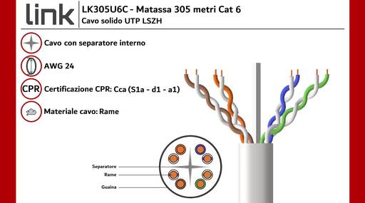 Cavo categoria 6 non schermato U/UTP guaina Halogenfree LSZH. Classe CPR: Cca, con requisiti aggiuntivi S1a - d1 - a1. LĘelevata classe CPR lo rende adatto per installazioni a rischio medio alto, come strutture sanitarie, locali di spettacolo, centri sportivi, alberghi, scuole, negozi, aziende con piØ di 300 persone, musei. Standard di riferimento EIA/TIA568 & ISO/IEC 11801. Sezione cavo AWG24, in rame. Guaina Halogenfree LSZH.