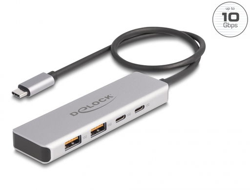 The USB hub by Delock can be connected via USB Type-C interface to a PC or laptop. It has two USB Type-A connectors as well as two USB Type-C connectors. Different USB devices such as docking stations, card reader, external enclosure etc. can be connected.