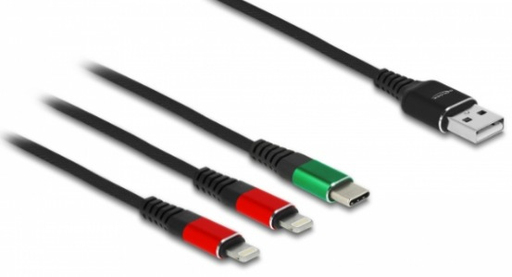Questo cavo di ricarica 3 in 1 Delock può essere utilizzato per la ricarica di diversi dispositivi, ad esempio tablet o smartphone con interfaccia Lightning™ o USB Type-C™ tramite una fonte di alimentazione USB.
