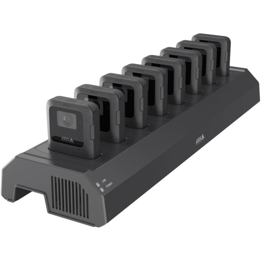AXIS W703 Docking Station 8 Bay charges the batteries and ensures easy data offloading of up to eight AXIS W110 body worn cameras.