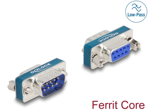 The RF/EMI interference suppression filter in the D-Sub adapter by Delock uses integrated broadband filters to prevent interruptions and signal noise, e.g. on Serial RS-232 / RS-485 and digital as well as analogue I/O interfaces.