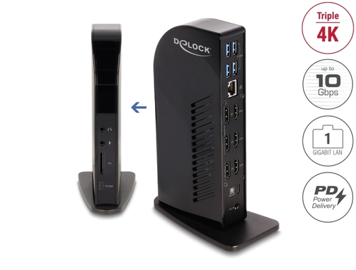 This docking station by Delock can be connected to a computer with a USB-C DP Alt Mode, Thunderbolt 3 or Thunderbolt 4 and provides a variety of interfaces. Three monitors can be operated at the monitor outputs at the same time. Five built-in USB ports allow the use of peripherals and another USB port can be used to charge mobile devices. Connectors for a microphone and speaker, a Gigabit network connection, as well as a card reader for SD memory cards complete the features.