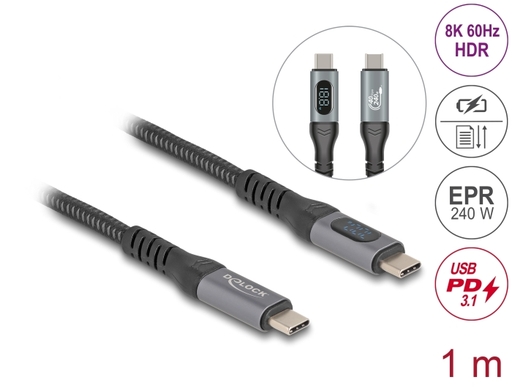 This USB 40 Gbps "full featured" cable by Delock enables the connection of various devices, such as smart phones, monitors, external enclosures and docking stations, via a USB Type-C, Thunderbolt 3 or Thunderbolt 4 port of a PC or laptop. A suitable PD power supply unit with a USB Type-C socket can be used for the charging function only. Support for the Extended Power Range resp. USB Power Delivery 3.1 standard means that connected devices can be supplied with power, up to 240 W (48 V / 5 A) is possible. The cable supports the transfer of USB as well as DisplayPort and PCI Express data.