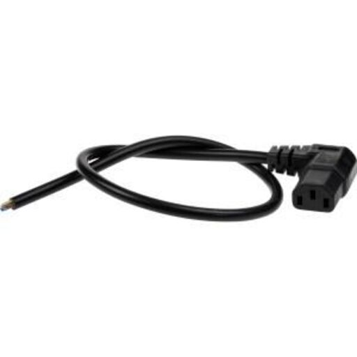 Angled C13 mains cable for use when limited space. Open ends for installation in terminal blocks etc.