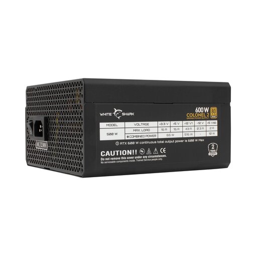 Alimentatore ATX White Shark COLONEL-2 con potenza di 600 W. Con una lunghezza di 160 mm e un peso di 1556 g, mantiene la sua posizione. Abbraccia la versatilità con connettori 20+4 x 1, 4/8 x 1, SATA x 6, MOLEX x 4. La ventola da 140 mm con cuscinetto idraulico assicura un efficienza di raffreddamento. Il suo standard 80 PLUS BRONZE unisce potenza ed economia. Un design completamente modulare aggiunge praticità. Con sicurezza OVP, SCP, OPP, SIP, UVP, protegge il tuo sistema. Flusso di corrente dominante: 43 A/16 A/16 A.