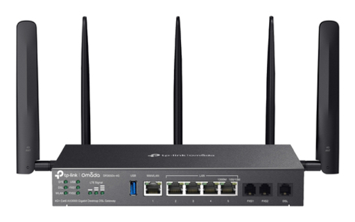 TP-Link - Omada 4G+ Cat6 AX3000 Gigabit Desktop DSL Gateway, 1 +ù Gigabit WAN/LAN Port, 4+ù Gigabit LAN Ports, 1 +ù DSL Port, 2+ùFXS Ports ,1+ù USB 3.0 Port,2 Nano SIM slots (4G+ Cat6), 574Mbps at 2.4 GHz + 2402 Mbps at 5 GHz (HE160) Wi-Fi Speed, VDSL Profile 35b 350/60 Mbps, 300 Mbps Download LTE Speed, Integration with Omada SDN Controller