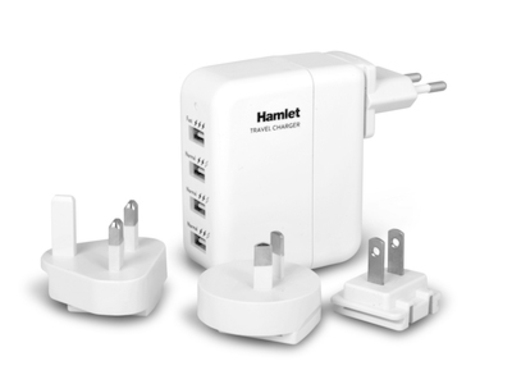 Hamlet Travel Charger è un compatto caricabatterie USB da parete che può caricare fino a quattro dispositivi elettronici contemporaneamente ed essere usato in più di 150 paesi grazie alle 4 spine intercambiabili.\nDotato di 4 porte USB di cui 1 da 2400mA e 3 da 1000mA, è ideale per ricaricare dispositivi mobili come smartphone, tablet, telefoni cellulari, lettori MP3, fotocamere digitali ecc.\nLa porta da 2400mA è particolarmente indicata per caricare Tablet PC e Smartphone con elevati requisiti di carica mentre le porte da 1000mA sono ideali per ricaricare piccoli dispositivi mobili come telefoni cellulari e lettori mp3.\n\n- Alimentatore universale 100-240V AC da parete con 4 porte USB\n- 4 spine intercambiabili per l'utilizzo in più di 150 paesi\n- Consente la ricarica di 4 dispositivi contemporaneamente\n- 1 porta 2.4A per iPad, Tablet o altre periferiche ad alto assorbimento\n- 3 porte 1A per iPhone, telefoni cellulari, smartphone e la maggior parte di dispositivi alimentati tramite USB\n- Input: 100-240V AC 50/60hHz\n- Output: 5V DC 2.4A (× 1) + 5V DC 1A (× 3)\n- Potenza: 20W (4A max)\n- Protezione da sovratensione e corto circuito\n- Compatibile con cellulari, smartphone, tablet pc, macchine fotografiche, lettori mp3\n- Dimensioni (senza spina): 69 x 80 x 36 mm