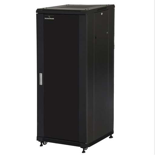 ARMADIO A PAVIMENTO SERIE FLOOR PRO 19" 27 UNITÀ, L600XP1000XH1388, porta con maniglia a chiave, apertura porta anteriore a 180°, apertura porta reversibile, ingresso cavi lato superiore e inferiore, Il basamento ha 7 aperture richiudibili per l'accesso dei cavi da diverse posizioni, 4 montanti laterali verticali da 19" regolabili in profondità, pannelli laterali removibili, colore nero, capacità di carico: 800 Kg