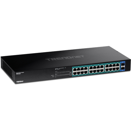 Switch Gigabit PoE+ de 26 puertos TPE-TG262 (v1.0R) • 24 puertos PoE+ Gigabit (30W por puerto) • 2 ranuras SFP Gigabit • Potencia PoE total disponible de 380W • Capacidad de conmutación de 52Gbps • Fuente de alimentación interna • Robusta carcasa de metal con opción de montaje en bastidor de 1U 19” Los switchs PoE+ Gigabit no administrados de TRENDnet ofrecen proporcionan un rendimiento de gran ancho de banda, facilidad de uso y fiabilidad. Estos switchs compatibles con IEEE 802.3at cuentan con una robusta carcasa metálica para montar en bastidor de 1U 19", con soportes de montaje incluidos. Estos switchs gigabit PoE+ también ofrecen ranuras SFP para aplicaciones de redes de fibra óptica de larga distancia. Los instaladores e integradores pueden ahorrar gastos de equipo y reducir el tiempo de instalación con los switchs Gigabit PoE+ no administrados de TRENDnet, suministrando 30W por puerto de alimentación PoE+ y datos a través de los cables Ethernet existentes. Conecte fácilmente en red dispositivos PoE, como puntos de acceso wireless de alta potencia, cámaras PTZ, señalización digital, decodificadores IPTV, controles de acceso y más con estos switchs gigabit PoE+