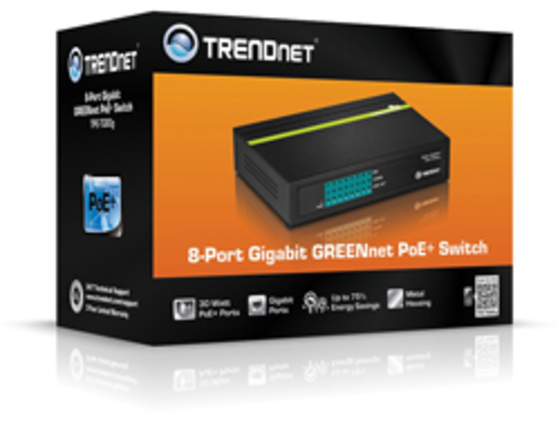 TRENDnet’s 8-Port Gigabit GREENnet PoE+ Switch, model TPE-TG80g, reduces equipment and installation costs by delivering data and power over existing Ethernet cables. This unmanaged switch offers eight Gigabit PoE+ ports which supply up to 30 watts of power per port for devices such as high power wireless access points, PTZ (Pan / Tilt / Zoom) internet cameras, and VoIP telephony systems. Auto sensing technology delivers 30 watts to 802.3at PoE+ devices (up to 3 devices), 15 watts to 802.3af PoE devices, and only data to non-PoE devices. GREENnet technology reduces energy consumption by up to 75% when the switch is not in use. Boost office efficiency and reduce network congestion with a total switching capacity of 16 Gbps. LED indicators display device status for efficient troubleshooting. This switch comes in a sturdy metal case and quickly adds PoE+, PoE, and non-PoE devices to your network.