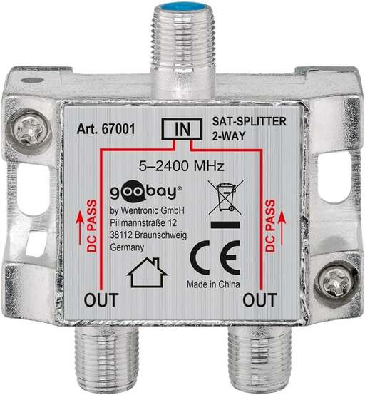 Divisore splitter per TV e Satellite 1 ingresso 2 uscite, può essere utilizzato per dividere il segnale TV oppure Satellite proveniente da antenna o parabola ed inviarlo a 2 prese/utenti.
