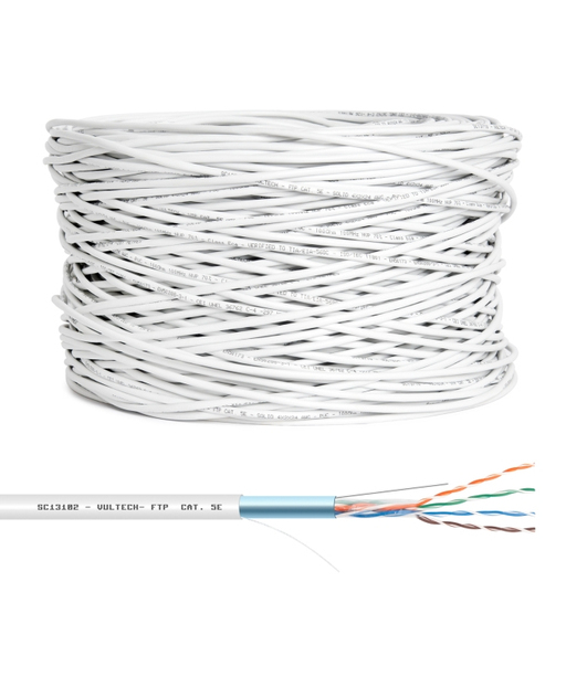Completamente schermata (FTP) e totalmente compatibile con gli standard di Categoria 5e, la matassa VulTech® 305 metri è realizzata con conduttori rivestiti in alluminio e rame a traccia che permettono ripetute piegature senza rischi di danneggiamento, prolungando così la vita del cavo.da 4 coppie di cavi cablati + filo di massa, questo cavo è consigliato per la realizzazione di impianti Ethernet Gigabit 10/100/1000, collegamento di impianti di video sorveglianza, ecc...