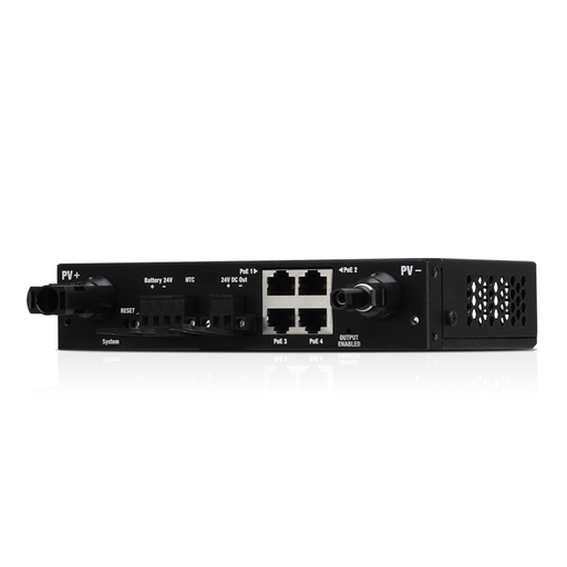 SunMAX™ SolarSwitch™ is a remote managed MPPT 24V 7A charge controller with a built-in 4 port 24V PoE 10/100Mbps switch and one DC output delivering up to 40W. It comes with built-in weather prediction service, which together with AI algorithms will provide you with critical information about your solar site`s existing and future performance. - Indoor or Cabinet(rack mountable) use\n- PV Panel Input 10 – 60V\n- 4-port 24V PoE output 10/100 switch\n- 24V DC-Out Terminal\n- Max output power 40W\n- External 24V Battery Charging up to 7Amps (supports SLA, AGL,AGM)