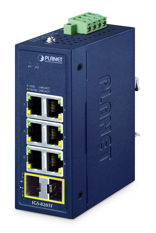 PLANET IGS-820TF Compact Industrial 6-Port 10/100/1000T and 2-Port 1000X SFP Gigabit Ethernet Switch is designed for industrial use, featuring 6 auto-negotiation 10/100/1000BASE-T RJ45 ports and 2 1000BASE-X SFP interfaces. It supports backward compatibility with 100BASE-FX transceivers, is housed in an IP30-rated rugged but compact case, and is equipped with a wide-ranging redundant power system (9~48V DC or 24V AC). The IGS-820TF is capable of operating in harsh environments with a temperature range from -40 to 75 degrees C.