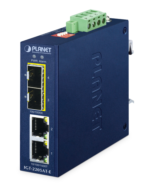 PLANET IGT-2205AT-E is an industrial-grade Gigabit media converter that provides non-blocking wire-speed performance and high flexibility for extending Gigabit Ethernet in harsh industrial environments. It is equipped with two 10/100/1000BASE-T RJ45 copper ports and two 100/1000BASE-X SFP fiber optic interfaces, enclosed in a rugged IP40-rated case with a redundant power system. The IGT-2205AT-E is ideal for applications such as surveillance deployment, industrial control, and wireless service in environments with extreme temperatures ranging from -40 to 75 degrees C.