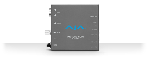 IPR-10G2-HDMI provides monitoring of UltraHD and HD SMPTE 2110 signals across 10 GigE to a HDMI ouput. It receives SMPTE ST 2110 over 10 GigE connectivity, formats the data, including UltraHD or HD video on a full-size HDMI interface. Associated audio from the video stream is extracted, synchronized, and embedded into the HDMI interface and also output on an analog RCA interface. The IPR-10G2-HDMI features 2x 10 GbE SFP+ cages allowing hitless switching, providing redundancy protection for critical distribution and monitoring applications. The IPR-10G2-HDMI also offers 1x Reference In via BNC. This makes it ideal for integrating into existing basebands environments such as master control, a truck, or an edit suite. IPR-10G2-HDMI extracts a SMPTE ST 2110 essence from an incoming IP stream and presents it for display on HDMI devices. Providing two SFP+ cases for protection with "hitless switching". Its rugged, fanless, Mini-Converter design is ideal for placement in a wide range of display and device scenarios, from studios to field. Monitor ST 2110 Video and Audio from anywhere on the Network.\nThe IPR-10G-HDMI is a SMPTE ST 2110 to HDMI Mini-Converter suited for point-of-use applications including source monitoring and an HDMI feed to compatible devices. The AJA IPR-10G-HDMI receives SMPTE ST 2110 IP video and audio, then formats the data for output on a full size HDMI 1.4b interface. With 3G/1.5G-SDI routers often at capacity while facilities await their transition to IP, there is a huge benefit in being able to send video sources from a feed, camera, router or edit bay via IP and provide HDMI monitoring at the destination. The audio associated with the video stream is extracted, synchronized, and then embedded into the HDMI interface as well as output on an analog RCA interface. Workflow\nIPR-10G2-HDMI provides HDMI output from SMPTE ST 2110 video and audio over IP streams. Combine your IPR-10G2-HDMI units with AJA KONA IP for HD (I/O card for use in desktop workstations) or receive UltraHD or HD from servers and more to instantly create a real-world ST 2110 workflow for video over IP production and monitoring. User Control\nIPR-10G2-HDMI provides two key methods for control. The Control LAN Ethernet port enables control of the Mini-Converter from web browsers on any platform and REST clients. The mini-USB connector facilitates quick and simple initial network configuration, and firmware updates.\n- 1x RJ-45 (IEC 60603-7) for 10/100/1000 Base-T Ethernet (IEEE 802.3-2012)\n- HTTP/1.1 (RFCs 7230, 7231, 7232, 7233, 7234, 7235)\n- Web and REST clients supported\n- 1x USB 2.0 Mini-B (IEC 62680-1) connector\n- AJA eMini-Setup of network parameters Universal Power Supply\nAll AJA Mini-Converters ship with a universal power supply that includes international plug connections for use around the world. Compact and Portable\nAJA Mini-Converters are small enough to fit behind a monitor, in the back of a rack or directly on a camera rig. A locking power connector can't accidentally pull loose and an optional P-TAP power cable allows for battery power in remote locations.