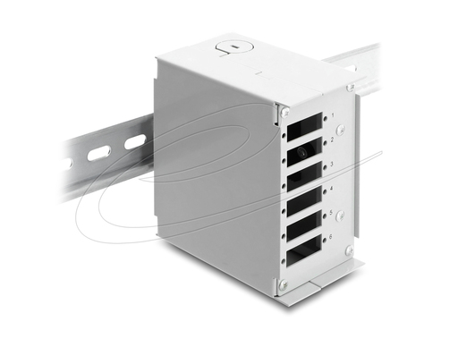 This fiber optic patch panel by Delock is suitable for mounting on a 35 mm wide DIN rail and can accommodate up to 6 fiber optic couplers of the types SC Duplex or LC Quad.