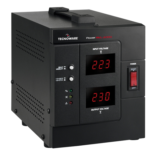 Stabilizzatore elettronico power reg, monofase, potenza 3000 va, stabilizzazione ±8%, ingresso cavo con spina schuko, 1 uscita schuko/italia ed 1 uscita iec 320 c19. Dotato di display LCD per la visualizzazione dei parametri di funzionamento
