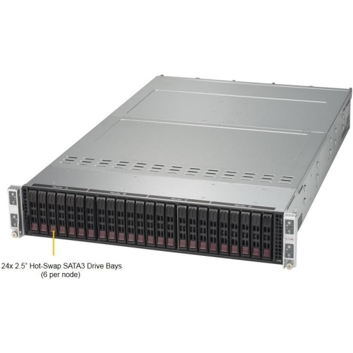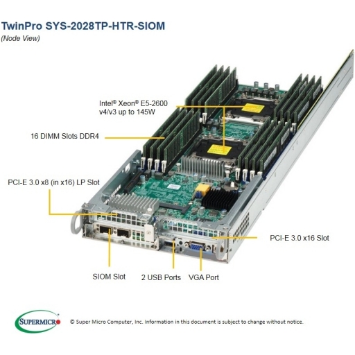 Dual socket R3 LGa 2011, 16x 288-pin DDR4 DIMM, Intel C612, 6x 2.5" SATA3, 2x USB 3.0, VGA, IPMI, PCI-E 3.0 x16 (LP), PCI-E 3.0 x8 (LP), SIOM, 2000 W SYS-2028TP-HTR-SIOM / SYS-2028TP-HC0R-SIOM / SYS-2028TP-HC1R-SIOM SYS-6028TP-HTR-SIOM / SYS-6028TP-HC0R-SIOM / SYS-6028TP-HC1R-SIOM 4x DP nodes in 2U; depth 28.5" (2028TP) / 30.5" (6028TP), Each Node (x4 nodes): Dual Socket R3 (LGa 2011) support: Intel Xeon processor E5-2600 v4/v3 family 16x DIMM slots; up to 2TB ECC 3DS LRDIMM or RDIMM DDR4-2400MHz 1x PCI-E 3.0 x16 Low-profile slot, 1 PCI-E 3.0 x8 Low-profile slot, 1 SIOM card support At least one SIOM network card must be bundled 6x 2.5" Hot-swap SATA3 drive bays per node (2028TP-HTR-SIOM) 6x 2.5" Hot-swap SAS3 (LSI 3008) drive bays per node (2028TP-HC0R-SIOM) 6x 2.5" Hot-swap SAS3 (LSI 3108) drive bays per node (2028TP-HC1R-SIOM) 3x 3.5" Hot-swap SATA3 drive bays per node (6028TP-HTR-SIOM) 3x 3.5" Hot-swap SAS3 (LSI 3008) drive bays per node (6028TP-HC0R-SIOM) 3x 3.5" Hot-swap SAS3 (LSI 3108) drive bays per node (6028TP-HC1R-SIOM) I/O ports: 1x Dedicated IPMI port, 1x Video, 2x USB 3.0 Titanium Level System management: Built-in Server management tool (IPMI 2.0, KVM/media over LAN) with dedicated LAN port 4x 80mm heavy duty fans w/ optimal fan speed control 2000W Redundant Titanium Level (96%) High-efficiency Power Supplies