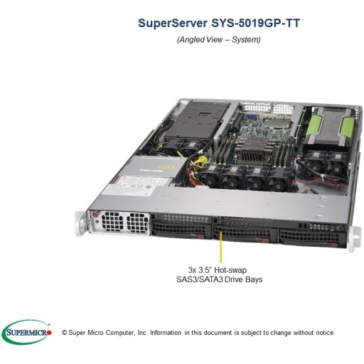 SuperServer 5019GP-TT - Single socket P (LGA 3647), Up to 768GB ECC 3DS LRDIMM, 3x Hot-swap 3.5" SAS/SATA, 1400W